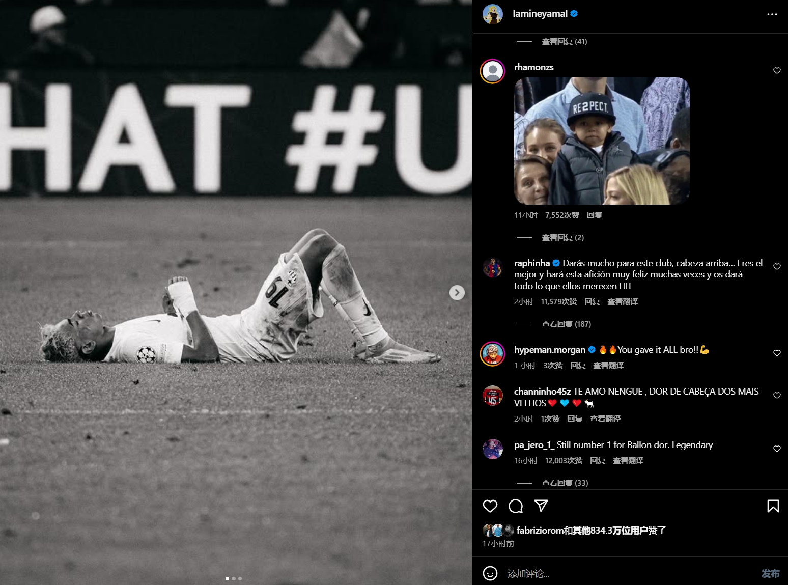 拉菲尼亚社媒留言亚马尔:请保持信心!未来你必将令球迷欢欣鼓舞