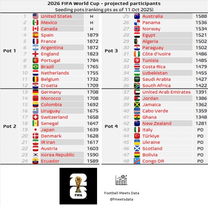 10月12日讯 正值10月国际比赛日,多个大洲的世预赛仍在进行中,2026世界杯已确定了20个席位归属,数据机构目前给出了世界杯分档的最新预测结果。