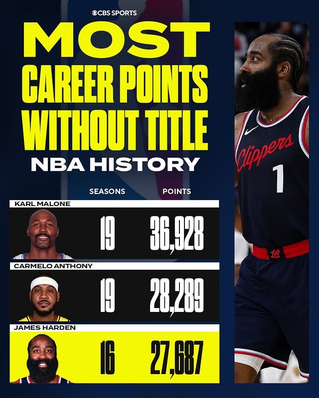 无冠球员得分榜:哈登27687历史第三 安东尼第二&马龙第一