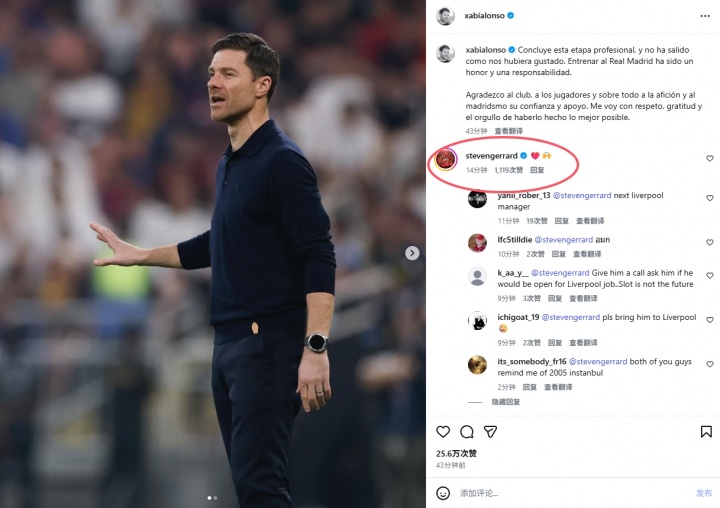 阿隆索社媒告别皇马+杰拉德评论,球迷热议:来执教利物浦吧